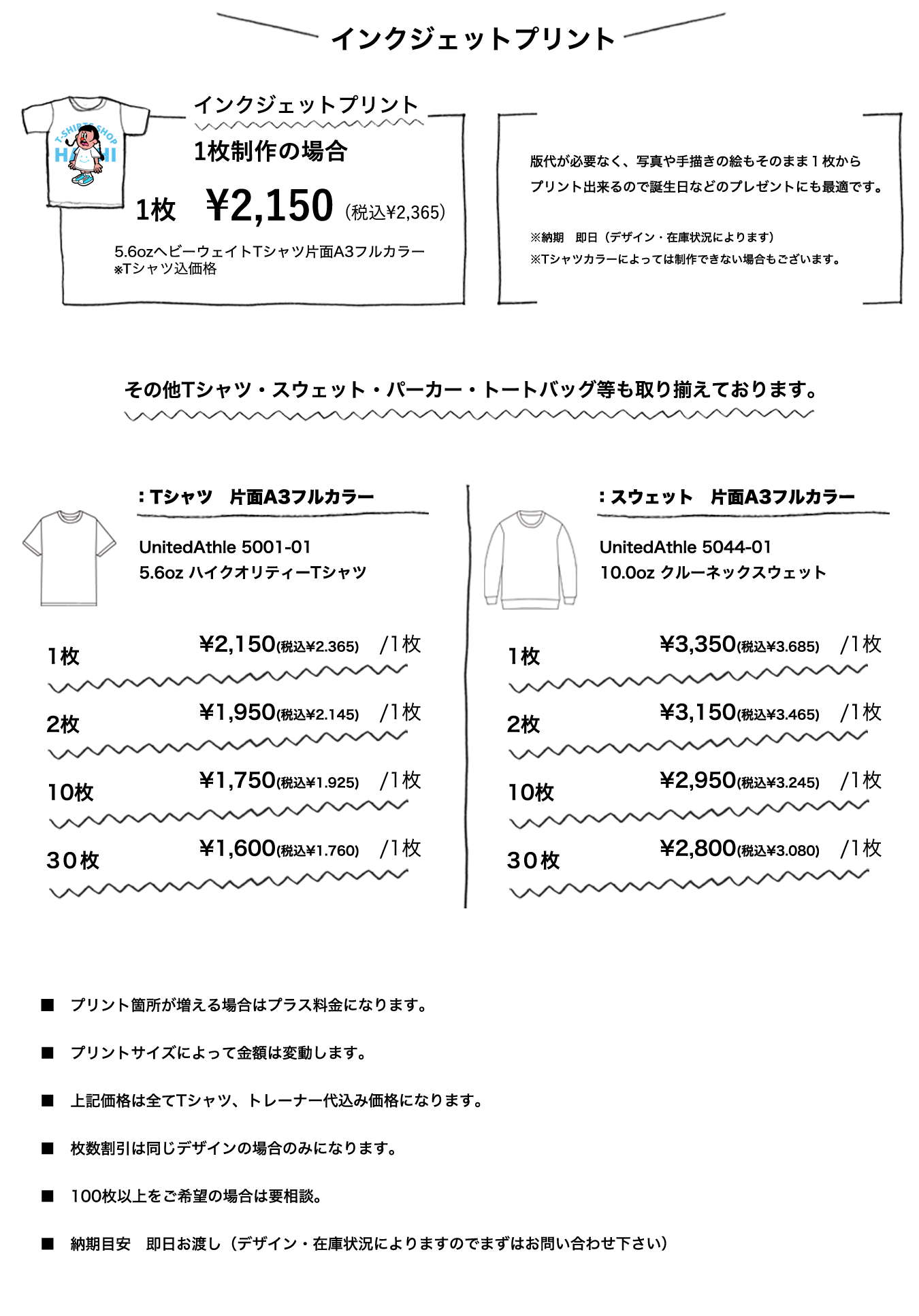 hachiのインクジェットプリントはフルカラープリントが出来るので、写真や手描きの絵もそのままプリント出来ます。その場ですぐにプリントが出来るので、お急ぎの方に最適で、直接プリント工程が見れるので安心してご利用頂けます。また、シルクスクリーンとは違い版代が必要ありません。色数を気にせず何色でもご利用になれます。もちろん、シルクスクリーン・カラー転写・刺繍などの他の方法でも作成できます。デザインの作成、画像の切り抜き色彩調整などもいたします。詳しくはスタッフまでお問い合わせください。デザインや予算のことなど、まずはお気軽にご相談ください。
